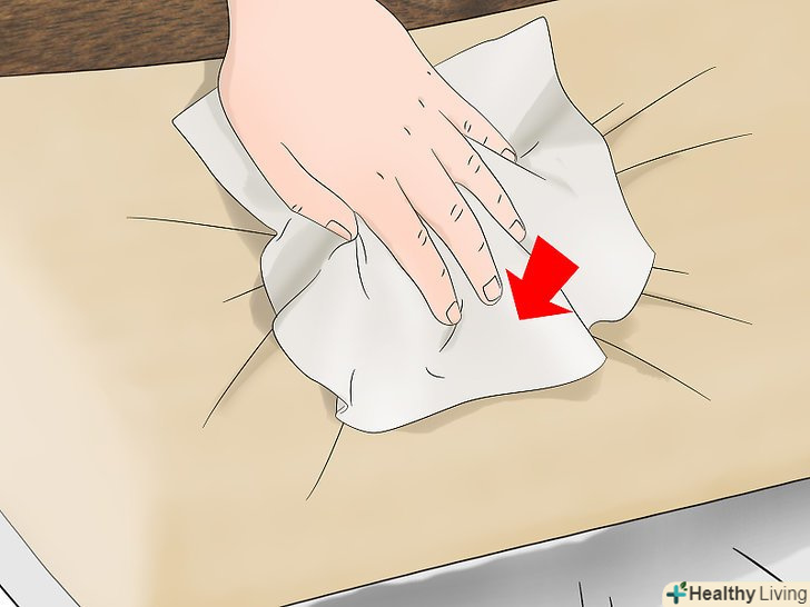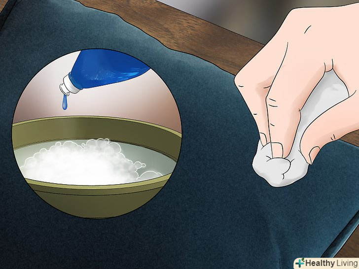 Обробіть плями на тканині і шкірі за допомогою мильної води. наберіть в миску невелику кількість води і додайте кілька крапель м'якої рідини для посуду. Розмішайте, щоб вода стала мильною, після чого змочіть у воді чисту серветку. Обробіть всі плями вологою серветкою. Потім змочіть чисту серветку в звичайній воді без мила, щоб прибрати всі мильні розлучення. Залиште подушки висохнути на відкритому повітрі. [5]- Якщо подушка зроблена зі шкіри, то в кінці краще використовувати кондиціонер для шкіри. Слід переконатися, що ваш кондиціонер призначений для оббивної, а не сідельної шкіри.