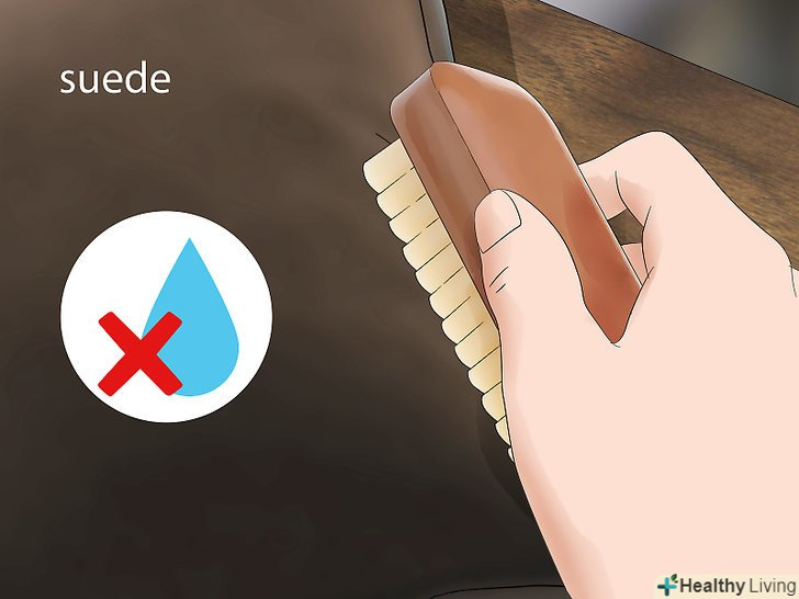 Не обробляйте водою замшеві чохли. очистіть всю подушку м'якою щіткою, щоб видалити бруд. Завжди виконуйте чистку уздовж волокон. Найкраще використовувати щітку для замші, хоча також підійде і чиста зубна щітка або Манікюрна щіточка. Якщо пляма не піддається, тоді скористайтеся одним з наступних варіантів: [6]- Обробіть плями білим оцтом. Змочіть щітку в оцті і обробіть пляму. Не хвилюйтеся щодо запаху, так як він швидко піде.