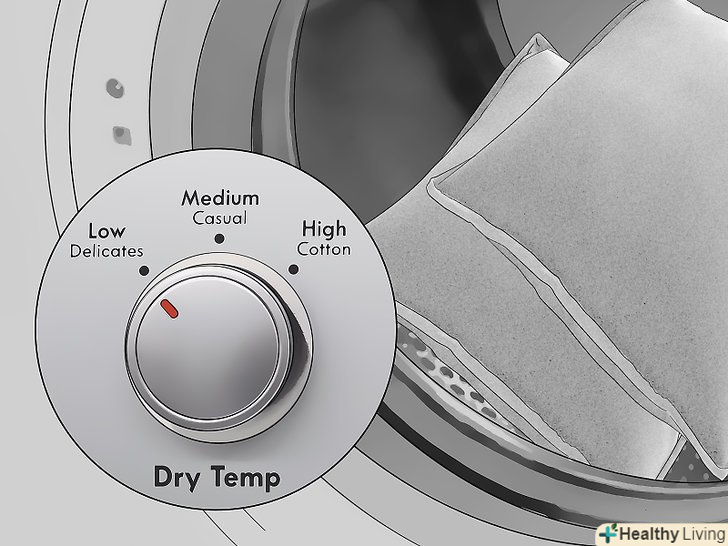 Висушіть подушку в сушарці при низькому значенні температури або без нагрівання. для пір'яних подушок використовуйте режим без нагрівання. Подушки з синтетичним наповнювачем можна сушити при низькій температурі. [12]