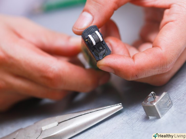 Замініть в запальничці Кремінь. [5] Кремінь-це деталь, яка висікає іскри. Він виглядає як крихітний чорний циліндр довжиною близько 6 міліметрів. Щоб поміняти Кремінь, зніміть прикривають його металеву кришку і коліщатко. Для цього злегка похитайте коліщатко з боку в бік. Знявши кришку і коліщатко, ви виявите під ними пружинку довжиною приблизно 2,5 - 3,8 сантиметра. На ній розташований Кремінь, що має вигляд чорного циліндра довжиною близько 6 міліметрів. Функція кременю полягає в тому, щоб при терті об обертове коліщатко висікати іскру. Зніміть з пружинки Старий кремінь і замініть його новим. Зберіть запальничку: вставте пружинку з новим кременем в призначене для неї гніздо, надіньте коліщатко і закрийте все металевою кришкою.- Новий Кремінь можна придбати приблизно за 50 рублів через Інтернет.
