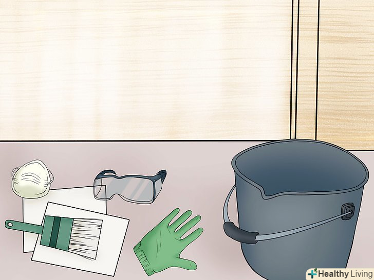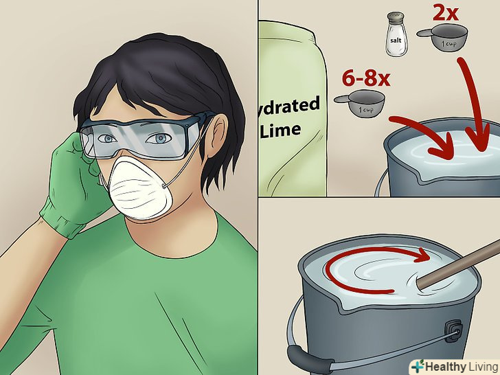 Приготуйте побілку. Візьміть велике відро і змішайте в ньому всі складові, щоб отримати побілку. Обов'язково надягайте Засоби індивідуального захисту, щоб звести до мінімуму можливу шкоду від порошкового вапна. Досить буде надіти респіратор, захисні окуляри і рукавички.- Вилийте у відро 4 літри води і висипте 400 грам солі, після чого добре перемішайте, поки сіль не розчиниться. [2]