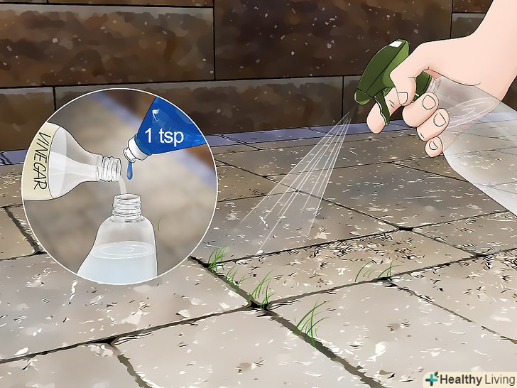 Вбийте бур'яни оцтовим розчином. заповніть пульверизатор дистильованим білим оцтом. Додайте в пляшку з розпилювачем одну чайну ложку засобу для миття посуду і струсіть її, щоб змішати інгредієнти. Розпиліть розчин на бур'яни, що ростуть в щілинах між камінням. [11]- Таким розчином краще користуватися в сонячні сухі дні. Якщо прохолодно або день дощовий і похмурий, результати будуть гірше.