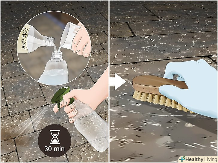 Приготуйте оцтовий розчин, щоб позбутися від незмивної бруду. змішайте в пульверизаторі дистильований білий оцет з водою. Щоб видалити глибоко в'їдаються плями, додайте менше води для більш концентрованого розчину. Розпиліть оцтовий розчин на камінь і почекайте півгодини. Потім зчистіть його нейлоновою щіткою. [2]- Після цього протріть область шваброю, щоб прибрати зайву воду і оцет.