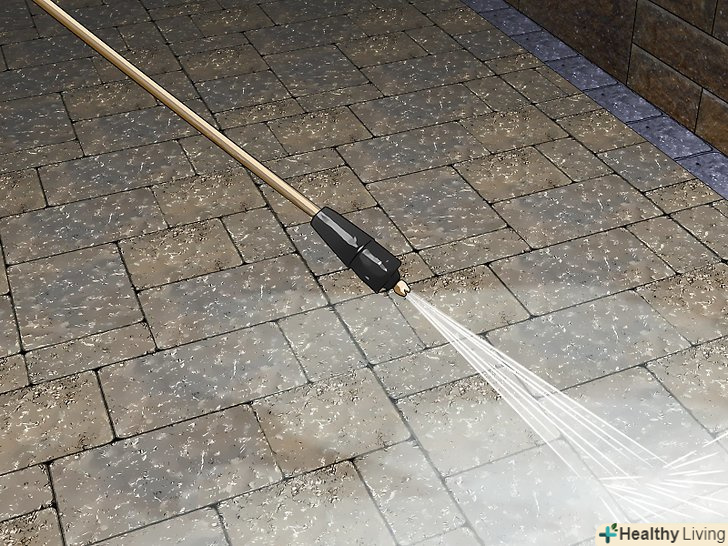 Використовуйте мийку високого тиску для в'ївся бруду. використовуйте струменеву насадку, щоб вода розпорошувалася, а не била струменем. Не підносьте шланг занадто близько до каменю, щоб не поламати і не пошкодити його. За допомогою мийки високого тиску можна легко зчистити навіть в'ївся бруд на кам'яній поверхні. [3]- Не розпилюйте воду на місця з'єднання, намагайтеся лити воду тільки на камені.