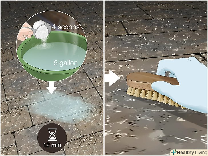 Використовуйте оксигенований відбілювач для чищення каменів. кисневмісний відбілювач містить карбонат натрію і, змішуючись з водою, утворює кисень. Додайте чотири ложки насиченого киснем відбілювача в 20-літрове відро, наповнене теплою або гарячою водою, і розмішуйте до повного його розчинення. Розлийте цей розчинник над ділянкою сухих каменів. Розчин повинен подіяти через 10-12 хвилин. [5]- Поки на одній ділянці розчин вбирається, почніть чистити щіткою ту ділянку, де пройшло достатньо часу.