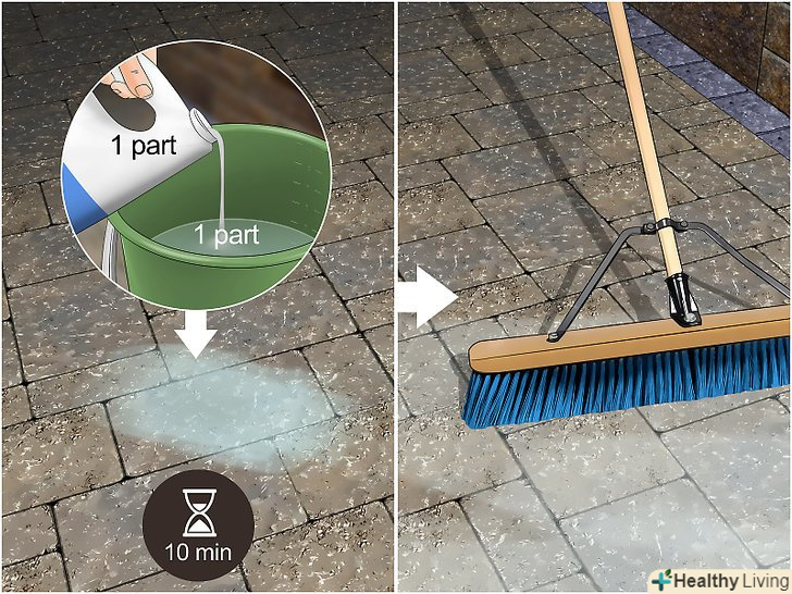 Видаліть накопичилася бруд і водорості за допомогою відбілювача. Відбілювач можна використовувати для очищення бруду, плям і водоростей, що утворилися на кам'яному патіо. Змішайте в відрі або лійці рівні частини відбілювача і води. Вилийте цей розчин на кам'яну поверхню. Зачекайте близько 10 хвилин, щоб розчин вбрався, а потім почистіть плями шваброю. Гарненько змийте його чистою водою. Якщо знадобиться, то сполосніть кілька разів. [6]- Використовуйте самий звичайний відбілювач без миючих та інших хімічних речовин в складі. Ці додаткові інгредієнти не тільки не допоможуть в очищенні, але і можуть, збираючись в грудки, додати нової бруду. Просто купуйте звичайний відбілювач.