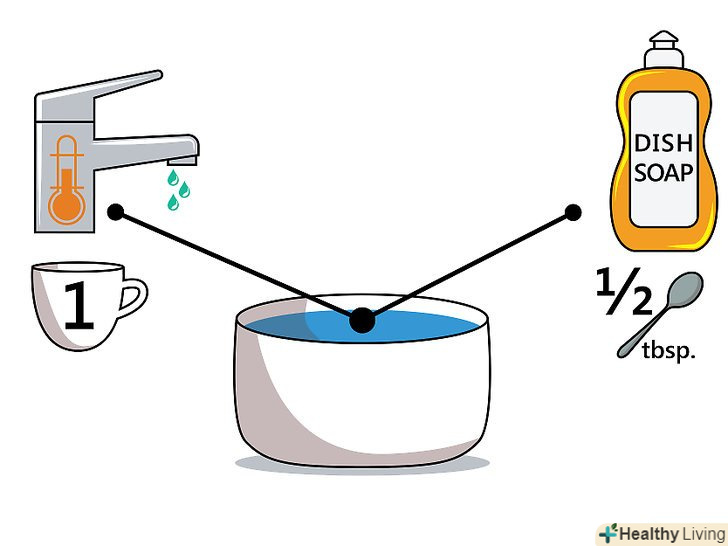 Налийте на пляму миючий засіб і воду. розведіть пів столової ложки рідини для миття посуду в склянці (240 мл) теплої води. Використовуйте те ж співвідношення інгредієнтів і для більших плям (наприклад, одна столова ложка кошти на 480 мл води). Залиште засіб на килимі на п'ять хвилин. [2]- Рідина для миття посуду можна замінити білим дистильованим оцтом і використовувати його в тих же пропорціях.