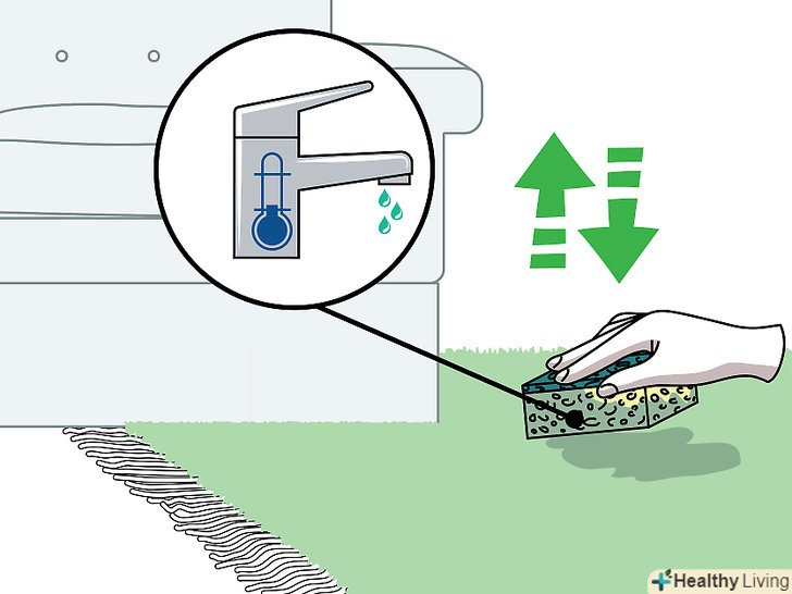 Промакніте пляма губкою або ганчіркою. через п'ять хвилин візьміть чисту вологу губку або ганчірку і промокніть нею місце, яке було замочено в миючому розчині. Губку або ганчірку слід замочувати тільки в холодній воді. [3]- Промакивайте пляму, починаючи з зовнішніх країв і рухайтеся до центру плями, щоб воно не збільшилося.