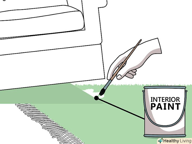 Спробуйте використовувати фарбу для внутрішніх робіт. якщо вибілене пляма знаходиться на непомітній ділянці килима, спробуйте зафарбувати його фарбою для внутрішніх робіт. Візьміть малярську кисть з дрібними щетинками і нанесіть на пляму тонкий шар фарби, рухаючись від основи волокон. При необхідності нанесіть ще кілька шарів, але дивіться, щоб вони були тонкими. [6]- Що хорошого у використанні такої фарби, так це те, що можна взяти кілька волокон з килима і віднести їх в будівельний магазин, щоб вам підібрали відповідний колір.