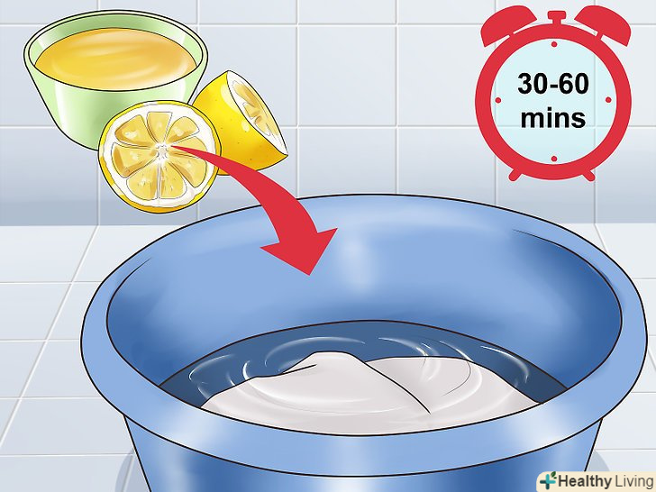 Додайте у воду чистий лимонний сік. лимонний сік є натуральним відбілюючим засобом. Можна використовувати лимонне ефірне масло або свіжовичавлений сік лимона. Якщо ви вичавили сік з лимона, процідіть його через марлю або дрібне сито, щоб на одяг не потрапили шматочки м'якоті. [13]- Якщо ви вирішили використовувати лимонний сік, можна вичавити два лимона, залити сік в миску або тазик, додати 4 літри теплої води і вимочувати в ній одяг протягом 30-60 хвилин.
