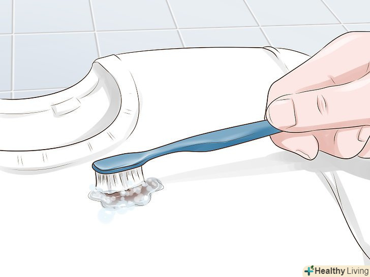 Приготуйте пасту з харчової соди. плями можна видалити за допомогою пасти з харчової соди і теплої води. Приготуйте пасту і нанесіть її прямо на пляму за допомогою зубної або одежної щітки. Зачекайте 10-15 хвилин, поки паста вбере бруд, потім змийте її теплою водою.- Цей досить м'який метод можна використовувати кілька разів, щоб позбутися від важкодоступних плям. Однак як слід споліскуйте тканину після кожного разу, так як залишилася сода може зробити матеріал крихким.
