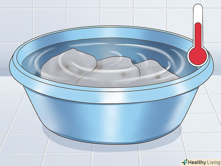 Після попереднього чищення миючим засобом або спреєм від плям вимочіть білий одяг в гарячій воді. кожен раз після виведення плям споліскуйте одяг і вимочуйте її в гарячій воді протягом 30-60 хвилин. Вода вбере залишки бруду і розчинить миючі засоби. [5]- Якщо ви використовували велику кількість мила, можливо, доведеться повторити даний крок двічі. Акуратно вичавлюйте одяг після кожного вимочування.