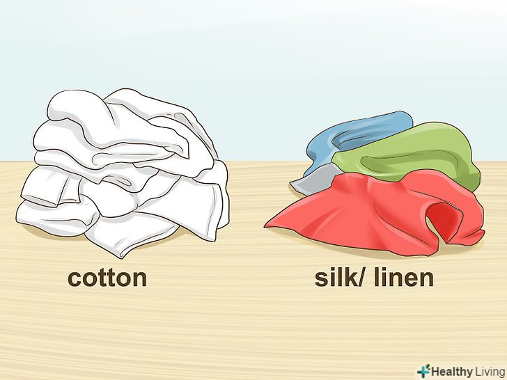 Розсортуйте речі відповідно до матеріалу. оптимальний режим прання визначається типом матерії: деякі тканини нормально переносять дуже гарячу воду, в той час як інші сідають або на них з'являються катишки. Розсортуйте речі відповідно до кольору і матеріалом, щоб тканина не змінила колір і не зіпсувалася. [6]- Бавовняні тканини добре переносять високі температури, в той час як шерсть і льон можуть сісти, тому їх слід прати в холодній або теплій воді. Синтетичні тканини відрізняються великою різноманітністю і вимагають різних умов прання.