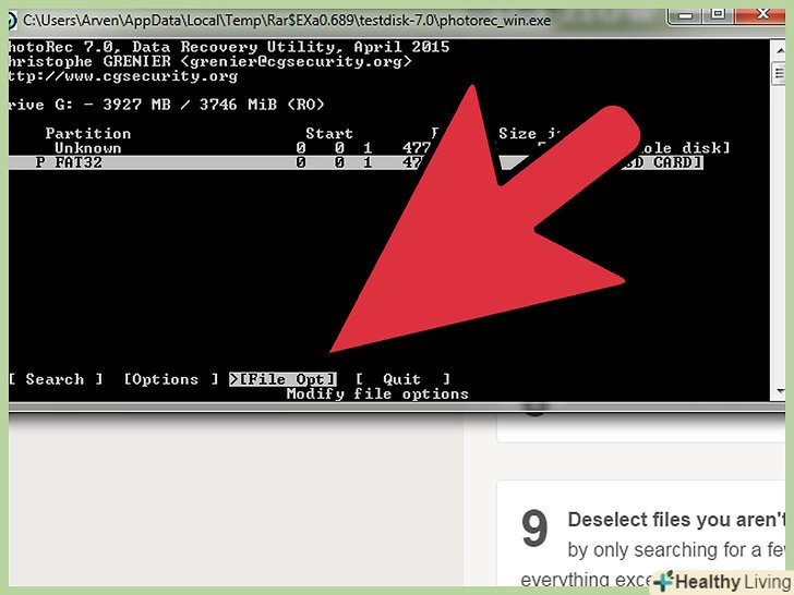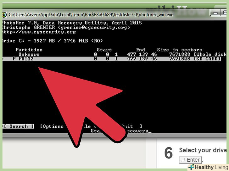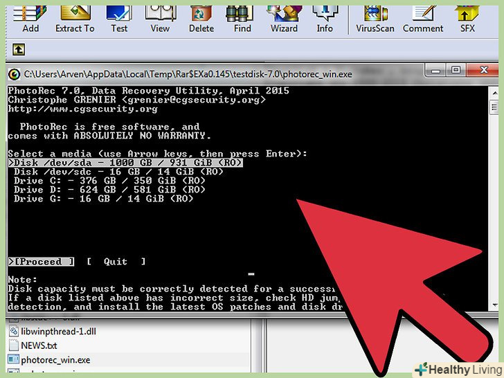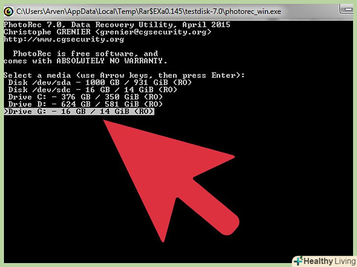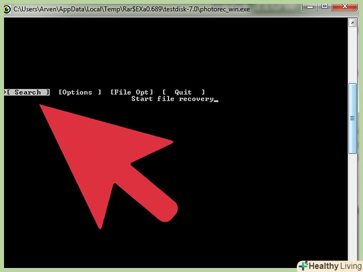 Запустіть PhotoRec. інтерфейс PhotoRec зроблений у вигляді командного рядка. Навігація в програмі здійснюється стрілками на клавіатурі.