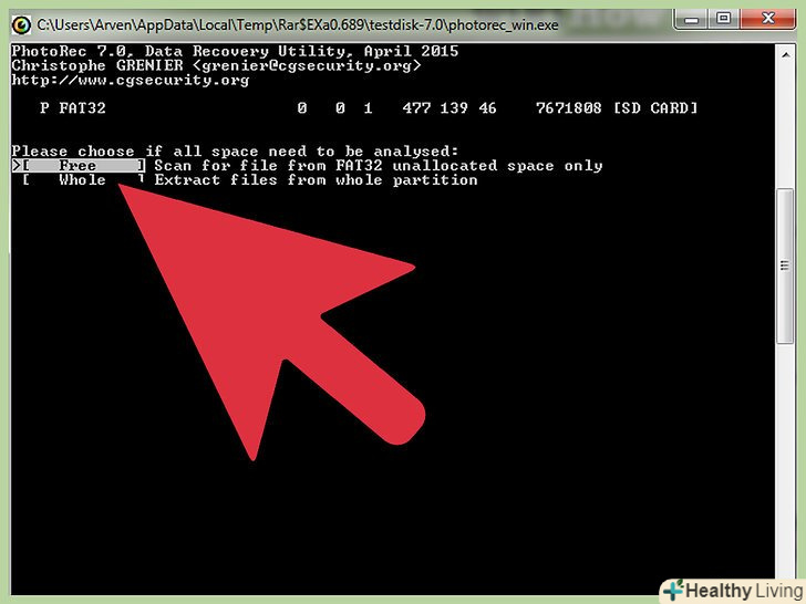 Виберіть, де програма повинна вести пошук. якщо ви хочете відновити видалені файли, вибирайте Free. Якщо ви намагаєтеся відновити файли з пошкодженої карти, вибирайте Whole.
