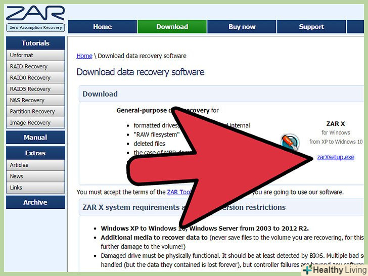 Завантажте та встановіть ZAR (zero Assumption Recovery). Повна версія ZAR платна, демо-версія дозволяє відновлення тільки файлів зображень. Завантажуйте ZAR тільки з сайту компанії-розробника.- На сайті ZAR натисніть посилання "image recovery" в нижній частині сторінки. Так ви зможете встановити демо-версію, яка дозволяє відновлення файлів зображень.