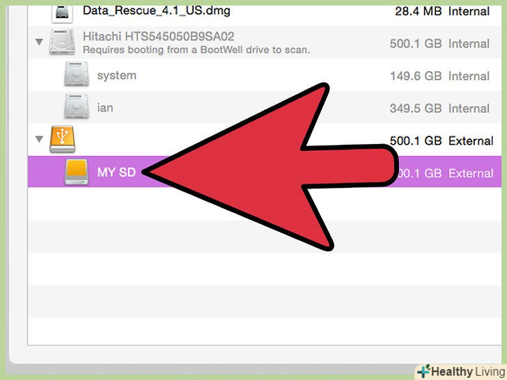 Виберіть вашу SD карту.у вікні Data Rescue з'явиться список доступних носіїв. Виберіть вашу SD карту зі списку.- Вам може бути запропоновано вибрати том диска. Як правило, SD карти мають тільки один том, але навіть якщо томів кілька — виберіть всю карту.