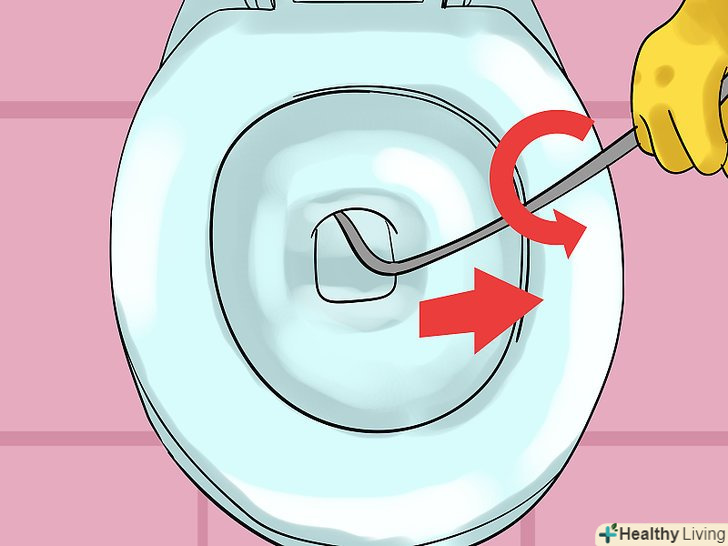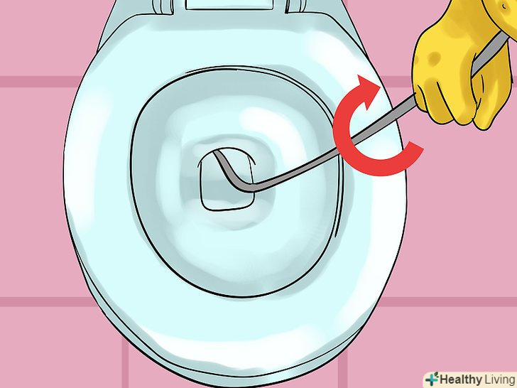 Повертайте вигнуту рукоятку за годинниковою стрілкою. опустивши кінець бура в унітаз, поступово і безперервно повертайте рукоятку на іншому кінці інструменту. Завдяки цьому бур почне подовжуватися і повільно проникати вглиб труби. Сантехнічний трос - це, по суті, гнучка металева спіраль, тому він може згинатися і повторювати контури зливних труб. [1]- Прочистити туалет буром не складніше, ніж прокрутити двигун пусковою рукояткою.