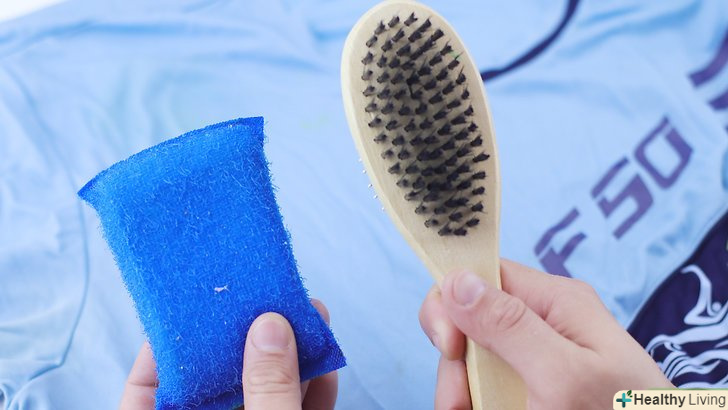 - Попередня обробка миючим засобом. налийте трохи універсального рідкого миючого засобу безпосередньо на пляму і обережно потріть м'якою зубною щіткою або рушником, змоченим у воді. Потріть з обох сторін тканини протягом декількох хвилин (тільки не протріть дірку). Залиште миючий засіб приблизно на 10 хвилин.