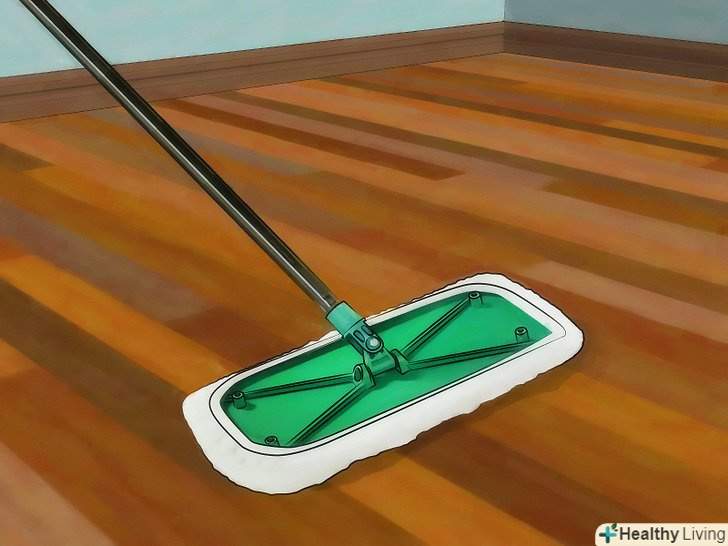 Підмітіть підлогу, пропилососьте його і протріть ганчіркою. настав час протерти поверхні і прибрати підлогу. Спочатку витріть пил з усіх поверхонь, потім підмітіть підлогу, пропилососьте, помийте підлогу ганчіркою.- Ганчірка або волоть збере більшу частину пилу з поверхонь, однак при цьому пил також полетить на підлогу. Не забудьте протерти світильник на стелі та інші лампи. Протріть пил за телевізором, ігровими приставками і маршрутизаторами.