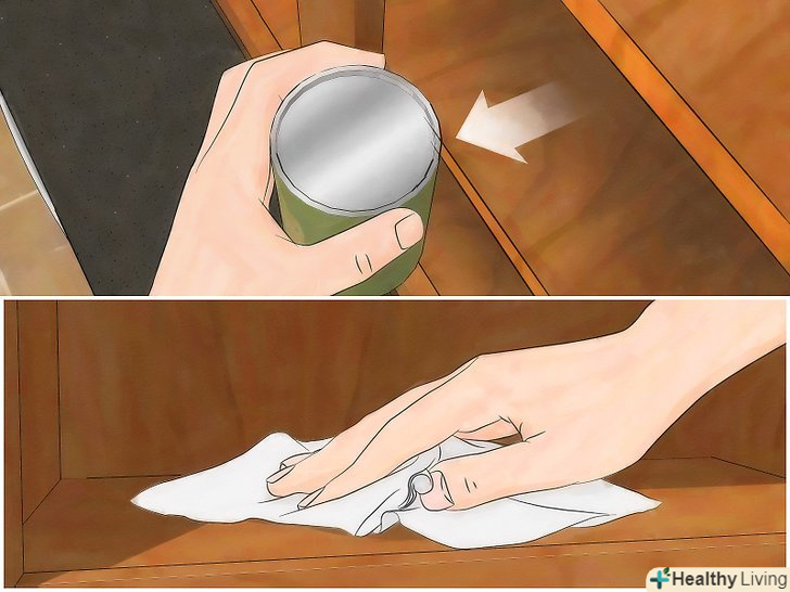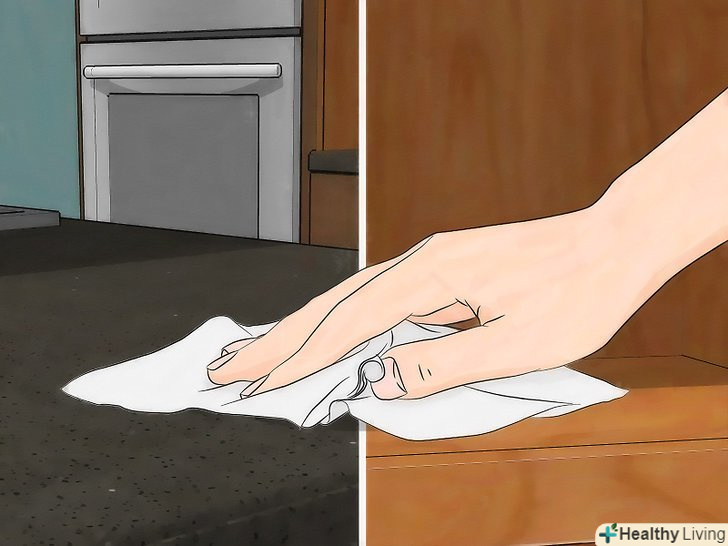 Витріть пил, підмітіть, пропилососьте і вимийте підлогу з ганчіркою. тепер потрібно витерти звільнилися поверхні, плиту і підлогу. Спочатку витріть пил і протріть всі поверхні, потім підмітіть підлогу, пропилососьте і помийте його ганчіркою.- Ганчірка або волоть добре зберуть пил, проте частина пилу може потрапити на підлогу. Не забудьте протерти шафки зверху.