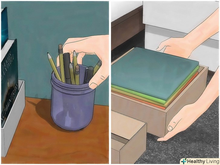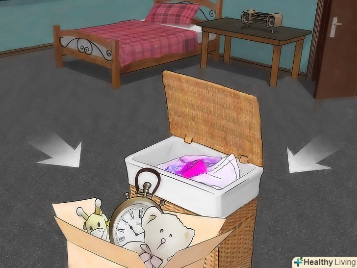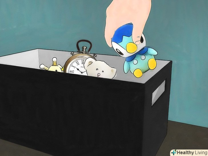 Варто постаратися вмістити всі речі, які вам потрібні, але які не повинні бути на виду, в один контейнер, сумку або коробку. завдяки цьому Вам буде простіше підтримувати порядок.- Приберіть все, що ви хочете залишити (наприклад, м'які іграшки, годинник) в коробку і поставте її під ліжко або в комору.