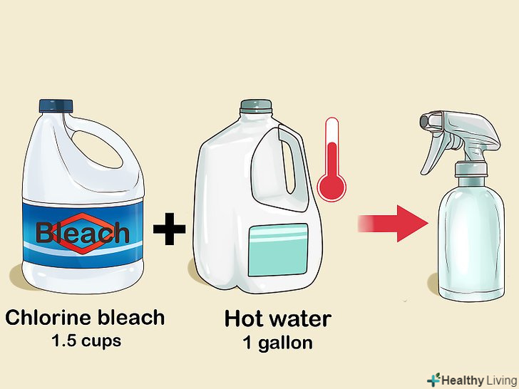 Приготуйте 10% хлорний розчин. змішайте півтори склянки (360 мл) хлорного відбілювача з 4 літрами гарячої води. Одягніть медичну маску або респіратор, щоб уберегти горло і легені. Перелийте розчин в пульверизатор. [3]