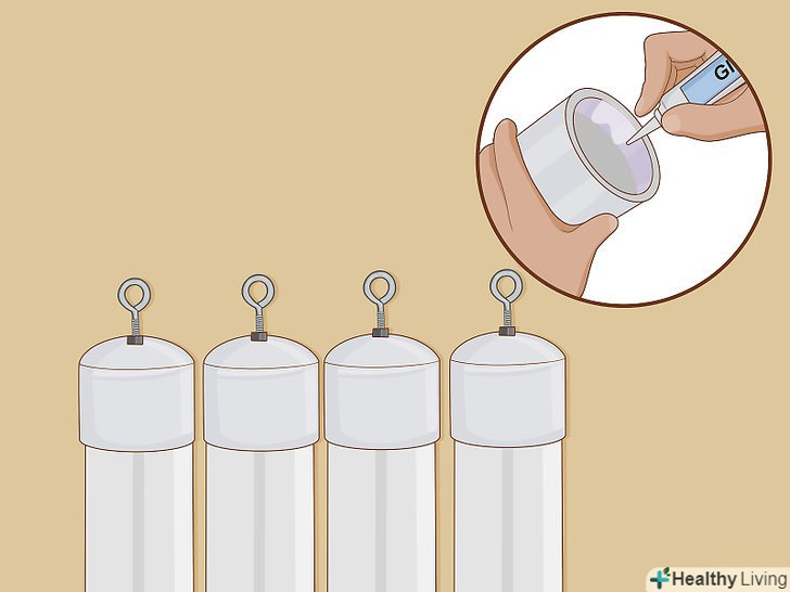Приклейте заглушки, в які вставлені болти з петлями, до труб. виробники клею для ПВХ часто рекомендують попередньо знежирити склеювані поверхні. Часто знежирювач стоїть на магазинній полиці поруч з клеєм. До багатьох маркам клею для ПВХ додається пензлик. [11]- При приклеюванні заглушок до труб виконуйте всі інструкції виробника клею. Почекайте стільки часу, скільки вказано на етикетці, до повного висихання клею.