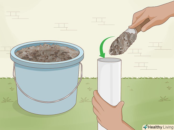 Замішайте цемент і наповніть їм труби. для змішування цементної суміші та води використовуйте 20-літрове відро. Дотримуйтесь інструкцій на етикетці. Пам'ятайте, що цемент швидко твердне, тому необхідно все робити без зайвого зволікання. Коли всі відрізки труби будуть заповнені цементом, притулите їх до стіни вертикально, поставивши на заглушку з петлею, і дайте цементу застигнути. [12]- На даному етапі вам може знадобитися допомога. Після того як ви замісили цемент, знадобиться одна людина, щоб тримати трубу у вертикальному положенні, і другий — щоб наповнювати труби цементом за допомогою совка. Трубу, яку Ви заповнюєте цементом, необхідно періодично злегка постукувати об землю, щоб цемент провалювався вниз і заповнював порожнечі.