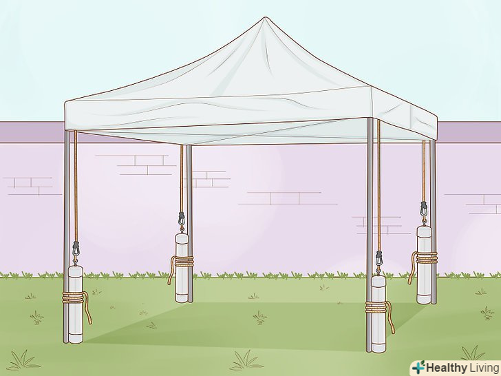 Прив'яжіть кожен обважнювач до каркасу шатра мотузкою або еластичним тросом. щоб прикріпити обважнювачі до змонтованого намету, прив'яжіть до петель на обважнювачах мотузку або прикріпіть трос затискачами. Інший кінець мотузки необхідно прив'язати або прикріпити до верхніх кутів каркаса над ніжками вашого шатра. Мотузка повинна бути досить довгою, щоб обважнювач ледь торкався землі або стояв на ній. Прив'яжіть по обважнювачу до всіх 4 кутах вашого шатра. [15]- Можна додатково приторочити обважнювачі до ніжок шатра біля самої землі за допомогою мотузки або текстильної застібки-липучки, щоб обважнювачі не розгойдувалися і про них ніхто не спіткнувся.