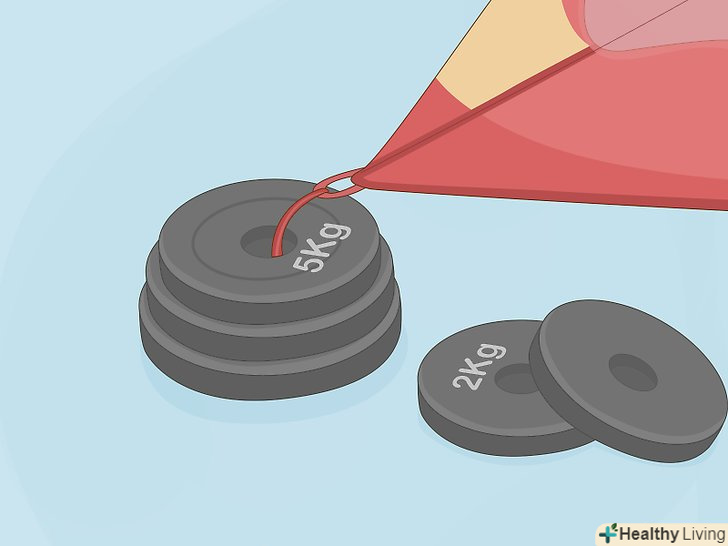 З метою економії використовуйте диски для штанги. Якщо у вас вдома є штанга, можна використовувати диски для зміцнення тенту. Складіть кілька дисків один на інший, поєднавши центральний отвір. Пропустіть в отвір мотузку, зав'яжіть диски вузлом, а потім прив'яжіть мотузку до верхньої перекладині каркаса вашого шатра. [3]- Якщо ви використовуєте намет на масовому заході, дізнайтеся у організаторів, чи дозволено використовувати диски для штанги в якості обважнення для шатра.