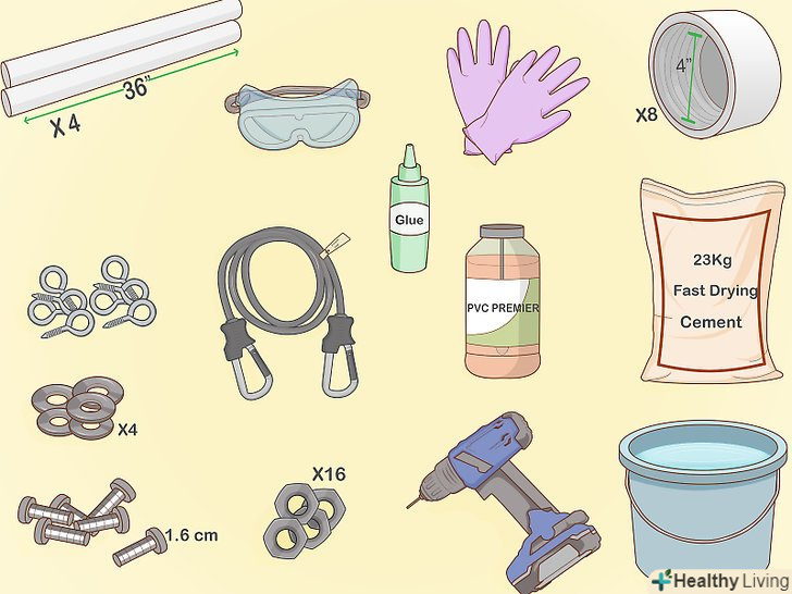Купіть в будівельному магазині труби з ПВХ та інші необхідні матеріали. щоб виготовити обважнювачі з труб, вам знадобиться 8 заглушок з ПВХ діаметром 10 см (4 дюйма), електродриль, захисні окуляри, рукавички, 16 гайок і 8 шайб діаметром 1,6 см (5/8 дюйма) і 4 болта з петлею діаметром 1,6 см (5/8 дюйма). Крім того, вам знадобляться 4 відрізки труби з ПВХ довжиною 90 см, клей і знежирювач для ПВХ, як мінімум 23 кг швидковисихаючого цементу, вода, ємність для змішування цементу, а також мотузка або еластичний трос.- У готовому вигляді обважнювачі для шатра будуть важити приблизно по 18 кг кожен. Можна виготовити обважнювачі меншого розміру; для цього знадобляться більш короткі відрізки труби діаметром 7,6 см (3 дюйма) і довжиною 60 см.