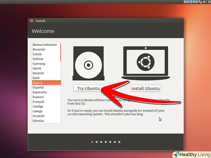 Вставте інсталяційний диск Ubuntu і завантажитеся з нього.у меню, що відобразилося, виберіть " протестувати Ubuntu без ...", щоб завантажити систему без її установки на жорсткий диск.