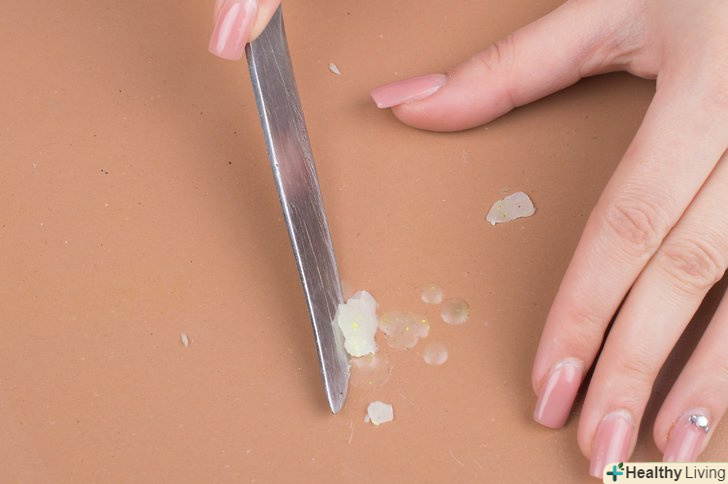 Скребіть оплавлений пластик або віск шпателем або ножем для масла. як тільки ацетон просочить залишки оплавленого речовини, вони стануть досить податливими. Якщо ви докладете до них невеликі зусилля шпателем або ножем, вони повинні відстати від поверхні. [7]