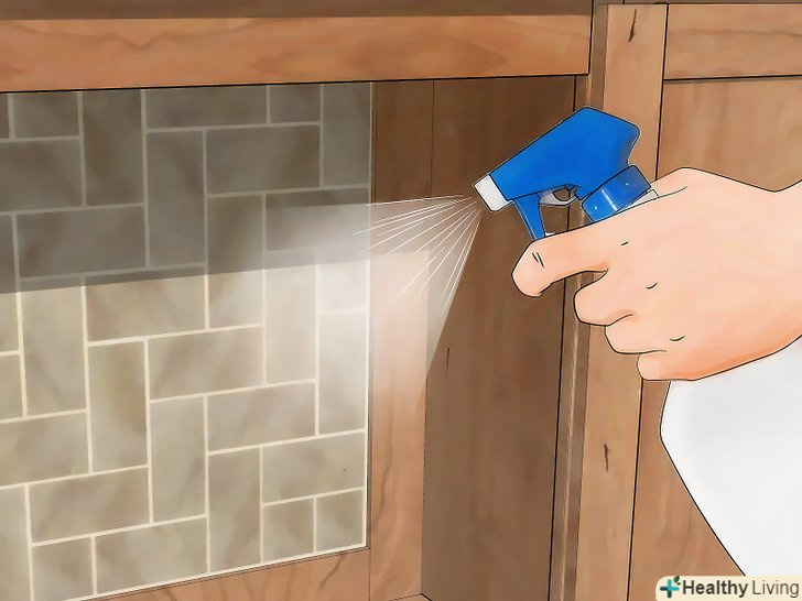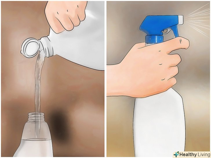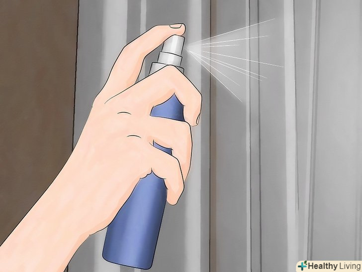 Розпиліть весь розчин по дому. неважливо, чи вибрали ви розчин оцту або антисептика – розпорошите його на всі поверхні, включаючи стіни, шафи, килим, стелю, драпірування. Зверніть увагу на липкі ділянки, де найкраще затримуються запахи. [10]- Перш ніж розпорошувати розчину, перевірте, чи не змінить розчин колір покриття – переконайтеся в тому, що структура і колір тканини не постраждають. Для цього розпорошите трохи суміші на непомітній ділянці тканини або поверхні. Зачекайте кілька хвилин і промокніть цю область серветкою. Зверніть увагу на будь-які зміни тканини і подивіться, чи не змінився колір серветки. [11]