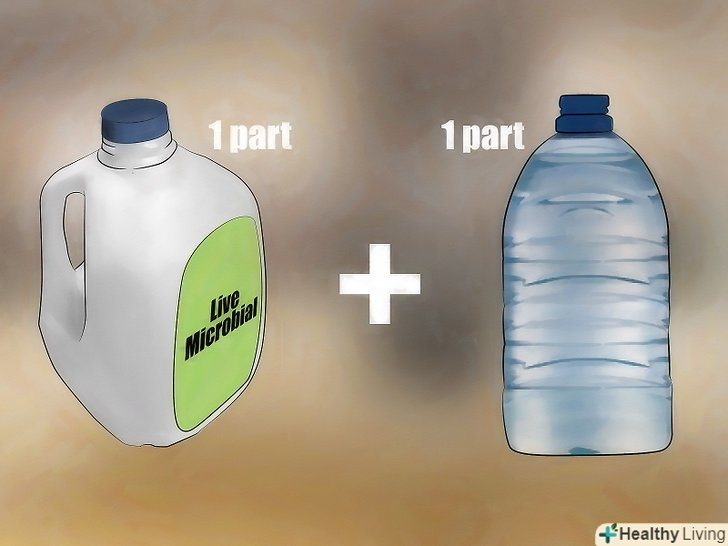 Змішайте воду з антисептиком в рівних пропорціях. Антисептик можна купити онлайн або в магазині. У деяких розчинах містяться живі бактерії, які поглинають неприємний запах, вироблений бактеріями. Це позбавить ваш будинок від небажаного аромату. [9]