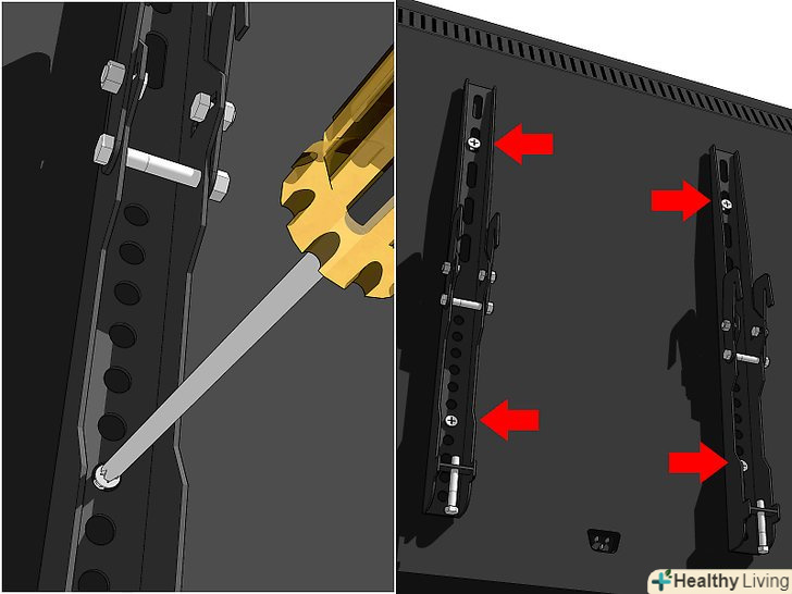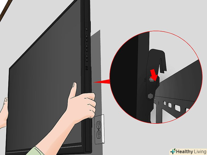Закріпіть РК телевізор на кріпленні, яке вже на стіні, слідуючи вказівкам, які поставляються разом з вашим кріпильним набором. різноманітні види кріплень мають різні способи монтажу телевізора, тому уважно читайте інструкцію для максимально безпечної установки вашого телевізора.- Не забувайте встановити Болти безпеки, які вбережуть ваш телевізор від падіння, в разі якщо ви захочете відрегулювати положення.