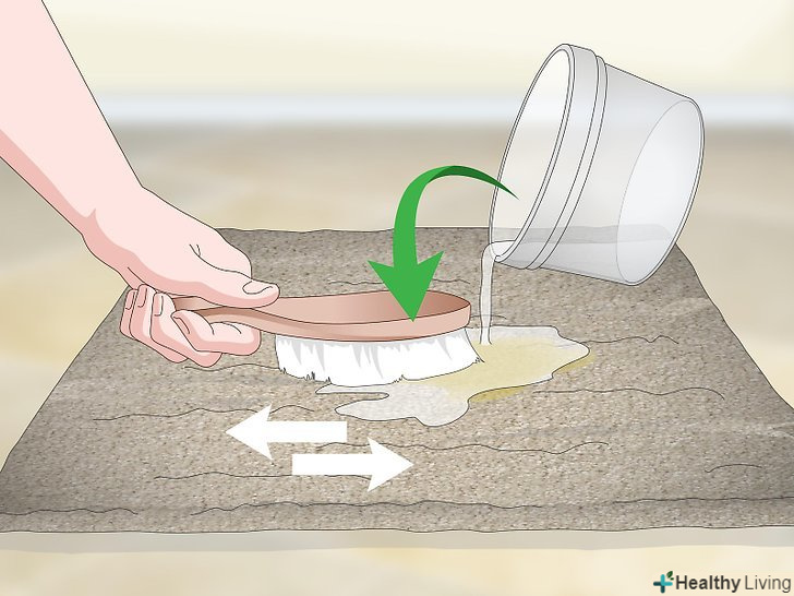 Налийте частину розчину перекису на пляму і втирайте розчин в пляму. Втирайте рухами взад-вперед. При цьому гарненько тисніть на щітку, щоб сода і розчин глибоко просочили пляма. [8]