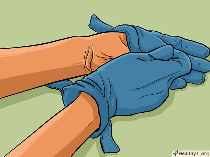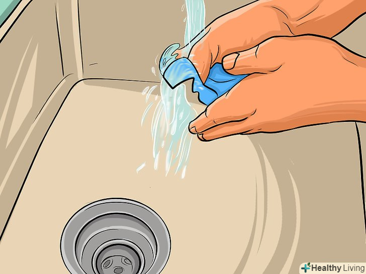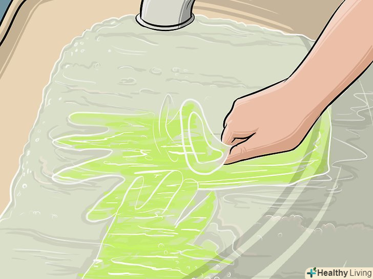 Промийте їх. приберіть пробку, щоб сточити брудну воду. Потім поверніть пробку на місце і знову наповніть раковину, тільки на цей раз холодною водою. Занурте рукавички в холодну воду і обполосніть їх від залишків мила. [5]