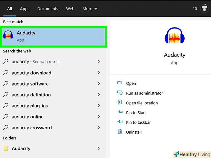 Відкрийте Audacity. Якщо Audacity не відкривається автоматично, відкрийте меню «Пуск», введіть audacity та виберіть Audacity у верхній частині меню «Пуск».