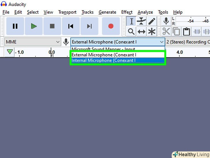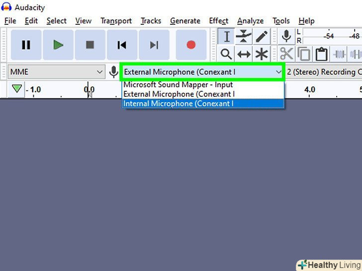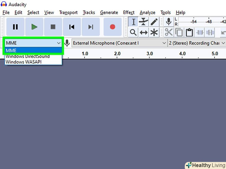 Переконайтеся, що в якості методу виведення звуку обраний MME. у випадаючому списку у верхньому лівому куті вікна Audacity повинна бути обрана опція»MME". В іншому випадку клацніть по випадаючому списку і виберіть mme.