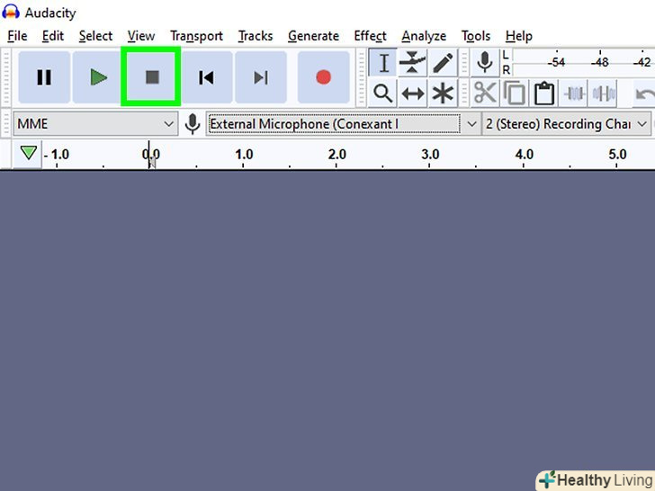 Зупиніть запис, коли закінчите. Натисніть кнопку «Стоп» на магнітофон, а потім — чорну кнопку «Зупинити»у верхній частині вікна Audacity.
