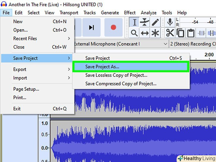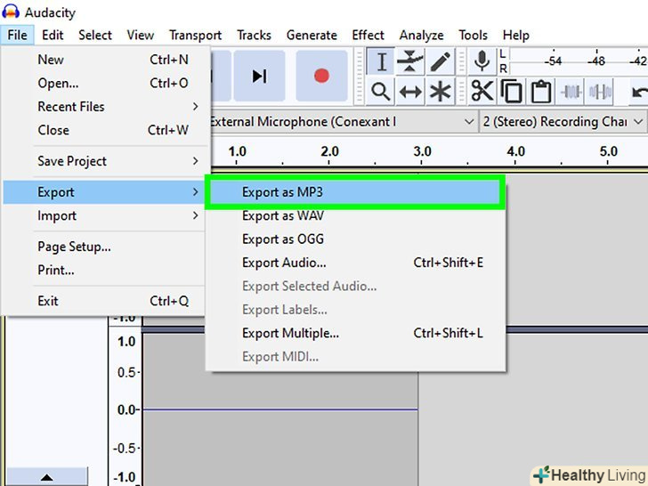 Збережіть аудіозапис. щоб створити аудіофайл у форматі MP3, виконайте наступні дії:- Натисніть на "Файл"у верхньому лівому куті вікна .