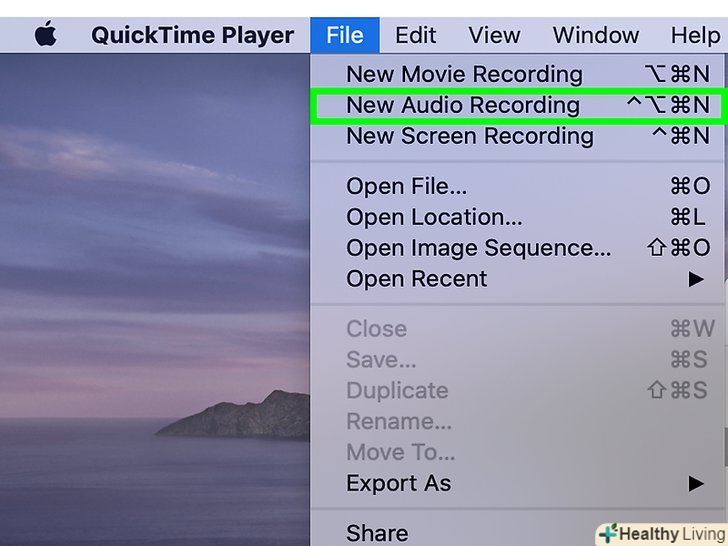 Натисніть наНовий аудіозапис у верхній частині спадного меню.так ви переключите вікно QuickTime на запис аудіо.