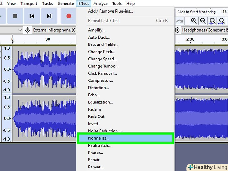 При необхідності нормалізуйте звук.отриманий запис можна поліпшити шляхом правильного застосування програмних засобів, головним серед яких є»нормалізація". В основному, до неї вдаються, щоб піки гучності не перевищували 100% рівень шкали (коли загоряються всі індикаторні смуги) і не опускалися нижче позначки 0 дБ (в залежності від способу вимірювання).[8]- Більшість аудіоредакторів дозволяють нормалізувати звукозапис.