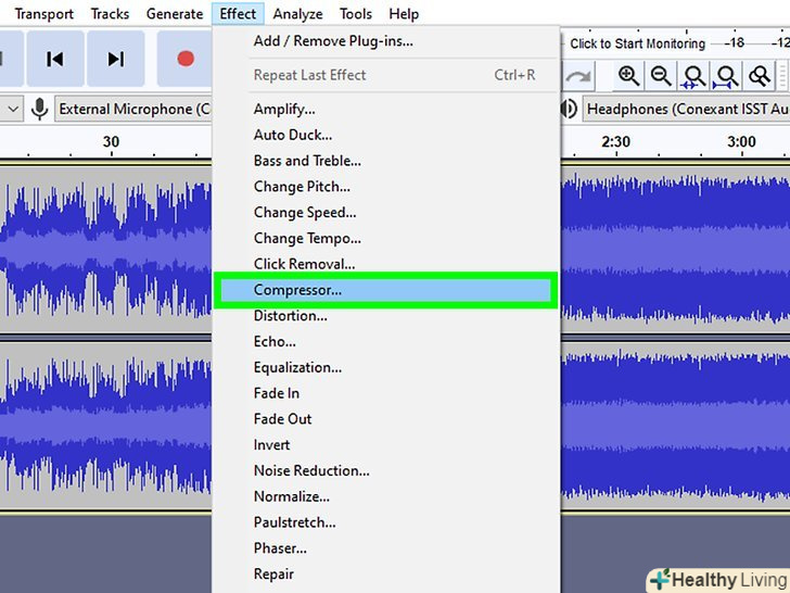 Виконайте стиснення.це не той спосіб, який варто застосовувати до всіх зроблених записів, інакше можна зробити музику млявою. Суть стиснення полягає в збереженні рівня гучних звуків і підвищенні рівня тихих. Так ви втратите динаміку між тихими звуками і гучними, але натомість отримаєте більш гучний запис. Для домашнього використання виконувати стиснення не обов'язково, але якщо ви записуєте компакт-диск для прослуховування в автомобілі, то це може бути дуже корисно.[9]