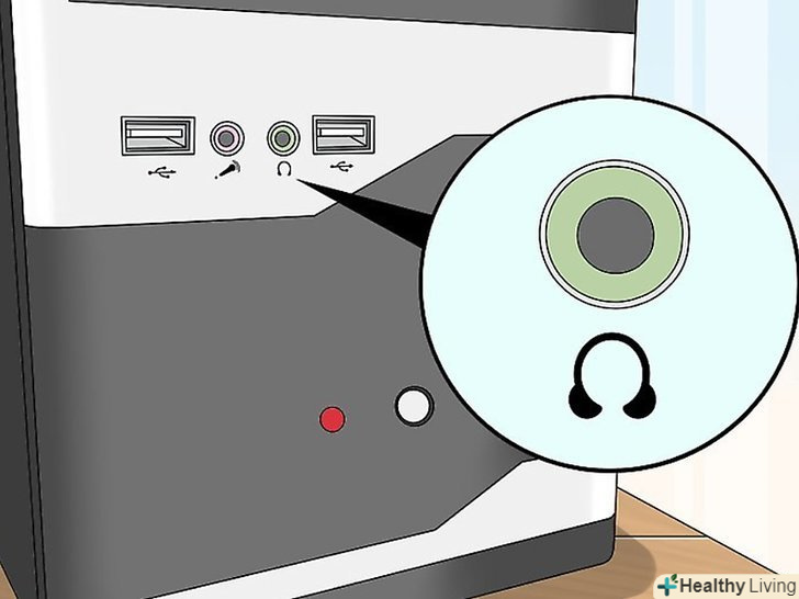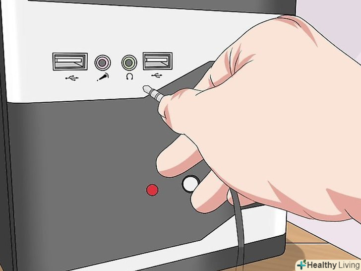 Знайдіть гніздо лінійного входу на комп'ютері.на комп'ютерах з роздільними портами для навушників і мікрофона цей роз'єм зазвичай відзначений рожевим кольором. Якщо на комп'ютері тільки один роз'єм для навушників 3,5 мм, значить, він підтримує як лінійний вхід, так і лінійний вихід.[2]- На настільних комп'ютерах це гніздо зазвичай можна знайти на задній або передній панелі комп'ютера.