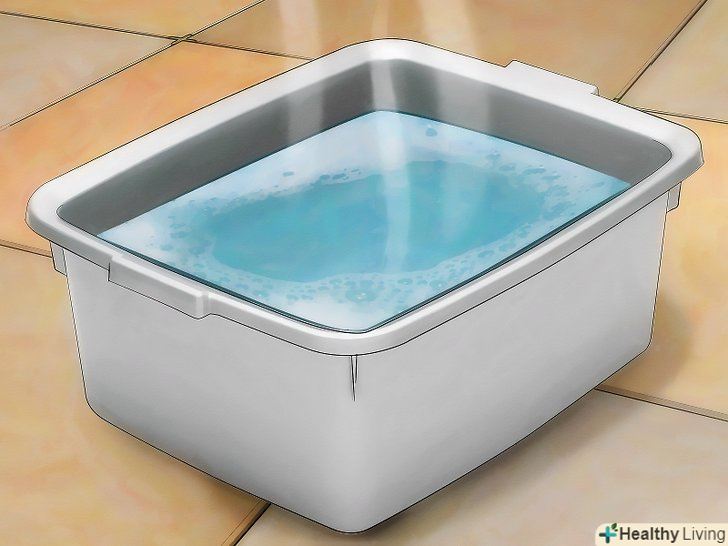 Залийте в таз гарячу воду. налийте в таз дуже гарячу воду. Якщо водопровідна вода недостатньо гаряча, можна підігріти трохи води і залити її в таз. Наливаючи воду, розчиніть в ній миючий засіб Oxiclean, похитуючи тазом з боку в бік. Будьте обережні: не перекиньте ємність і не виплесніть з неї воду.