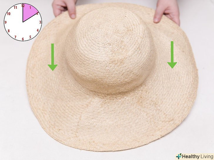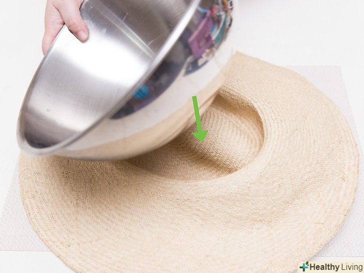 Одягніть капелюх на круглий предмет. замість рушники можна взяти миску або інший відповідний предмет і щільно надіти капелюх на нього. Так ви зможете повернути тулії правильну округлу форму.- Для фіксації капелюхи на предметі і забезпечення її гарантованого виправлення можуть використовуватися будь обважнювачі, затискачі, мотузочки. [6]