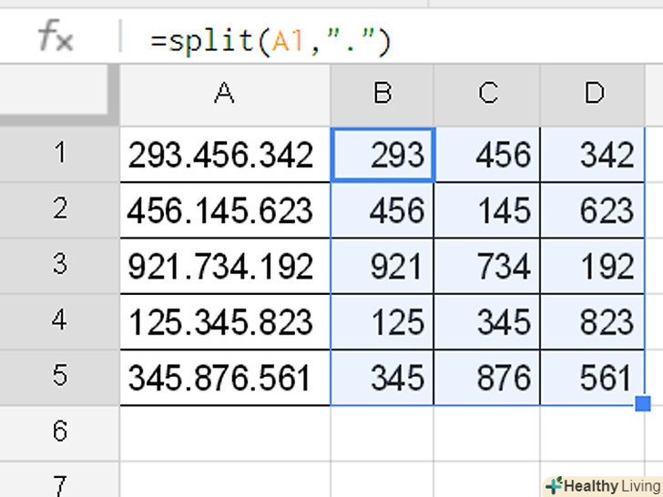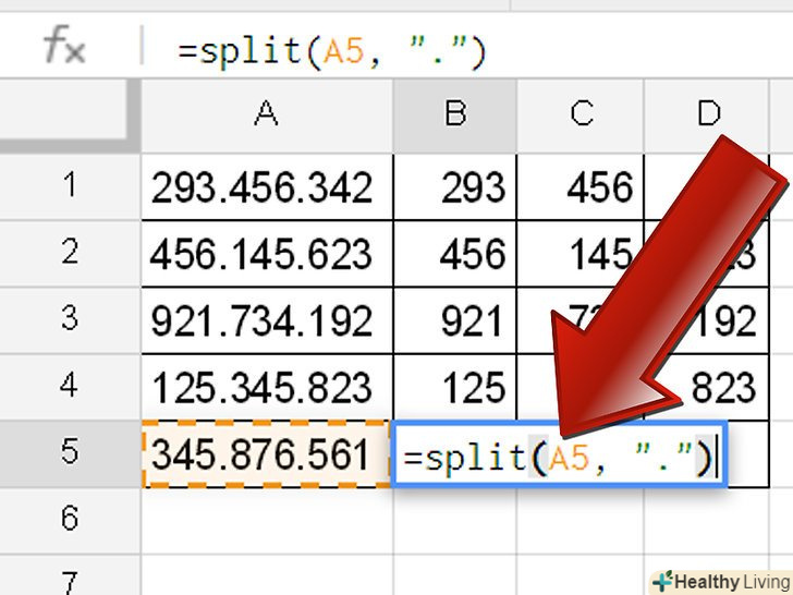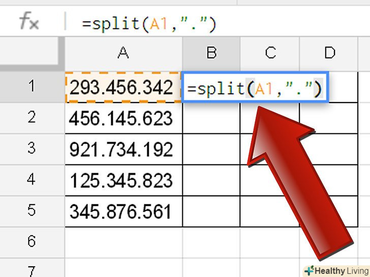 У першій комірці введіть формулу. Формула " = split ("дозволить вам вказати, що ви хочете розділити, а результати будуть поміщені в порожніх колонках, наступних за цією формулою. Після знака "=" введіть назву комірки, яку ви хочете розділити. Після імені комірки вкажіть символ, який буде роздільником. Вміст комірки буде розділятися після кожного такого символу.
